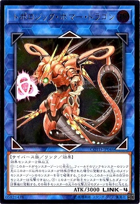 トポロジック・ボマー・ドラゴン》 † リンク・効果モンスター リンク4/闇属性/サイバース族/攻3000 【リンクマーカー:上/左下/下/右下】 効果モンスター2体以上 (1):このカードがモンスターゾーンに存在し、 フィールドのリンクモンスターのリンク先にこのカード以外のモンスターが特殊召喚された場合に発動する。 お互いのメインモンスターゾーンのモンスターを全て破壊する。 このターン、このカード以外の自分のモンスターは攻撃できない。 (2):このカードが相手モンスターを攻撃したダメージ計算後に発動する。 その相手モンスターの元々の攻撃力分のダメージを相手に与える。