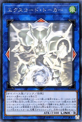 《エクスコード・トーカー》 † リンク・効果モンスター リンク3/風属性/サイバース族/攻2300 【リンクマーカー:上/左/右】 サイバース族モンスター2体以上 このカード名の(1)の効果は1ターンに1度しか使用できない。 (1):このカードがリンク召喚に成功した時、 EXモンスターゾーンのモンスターの数だけ、 使用していないメインモンスターゾーンを指定して発動できる。 指定したゾーンはこのモンスターが表側表示で存在する間は使用できない。 (2):このカードのリンク先のモンスターは、 攻撃力が500アップし、効果では破壊されない。
