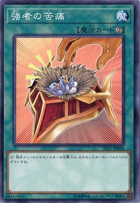 《強者きょうしゃの苦痛くつう/Burden of the Mighty》 † 永続魔法 (1):相手フィールドのモンスターの攻撃力は、 そのモンスターのレベル×100ダウンする。