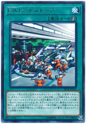 F.A.フォーミュラアスリートピットストップ/F.A. Pit Stop》 † 速攻魔法 このカード名の(1)(2)の効果はそれぞれ1ターンに1度しか使用できない。 (1):自分フィールドの「F.A.」モンスター1体を対象として発動できる。 そのモンスターのレベルを2つ下げ、自分は自分の墓地の「F.A.ピットストップ」の数+1枚をデッキからドローする。 (2):自分メインフェイズに墓地のこのカードを除外し、自分の墓地の「F.A.」モンスター1体を対象として発動できる。 そのモンスターを特殊召喚する。 この効果はこのカードが墓地へ送られたターンには発動できない。