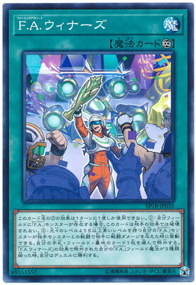 F.A.フォーミュラアスリートウィナーズ/F.A. Winners》 † 永続魔法 このカード名の(2)の効果は1ターンに1度しか使用できない。 (1):自分フィールドに「F.A.」モンスターが存在する場合、 このカードは相手の効果では破壊されない。 (2):元々のレベルより5以上高い「F.A.」モンスターが 相手モンスターとの戦闘で相手に戦闘ダメージを与えた時に発動できる。 自分の手札・フィールド・墓地のカード1枚を選んで除外する。 「F.A.ウィナーズ」の効果で除外された 自分の「F.A.」フィールド魔法カードが3種類揃った時、自分はデュエルに勝利する。
