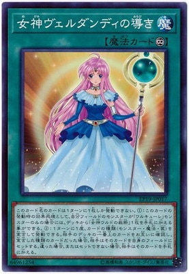 《女神めがみヴェルダンディの導みちびき/Goddess Verdande's Guidance》 † 永続魔法 このカード名のカードは1ターンに1枚しか発動できない。 (1):このカードの発動時の効果処理として、 自分フィールドのモンスターが「ワルキューレ」モンスターのみの場合には、 デッキから「女神ウルドの裁断」1枚を手札に加える事ができる。 (2):1ターンに1度、カードの種類(モンスター・魔法・罠)を宣言して発動できる。 相手のデッキの一番上のカードをお互いに確認し、 宣言した種類のカードだった場合、相手はそのカードを自身のフィールドにセットする。 違った場合、またはセットできない場合、相手はそのカードを手札に加える。