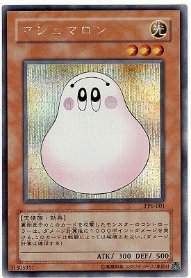 《マシュマロン/Marshmallon》 † 効果モンスター 星3/光属性/天使族/攻 300/守 500 (1):このカードは戦闘では破壊されない。 (2):裏側表示のこのカードが攻撃されたダメージ計算後に発動する。 このカードを攻撃したモンスターのコントローラーは1000ダメージを受ける。