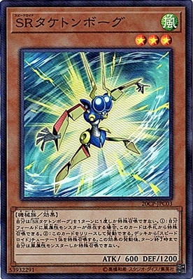 《SRスピードロイドタケトンボーグ/Speedroid Taketomborg》 † 効果モンスター 星3/風属性/機械族/攻 600/守1200 自分は「SRタケトンボーグ」を1ターンに1度しか特殊召喚できない。 (1):自分フィールドに風属性モンスターが存在する場合、 このカードは手札から特殊召喚できる。 (2):このカードをリリースして発動できる。 デッキから「スピードロイド」チューナー1体を特殊召喚する。 この効果の発動後、ターン終了時まで 自分は風属性モンスターしか特殊召喚できない。