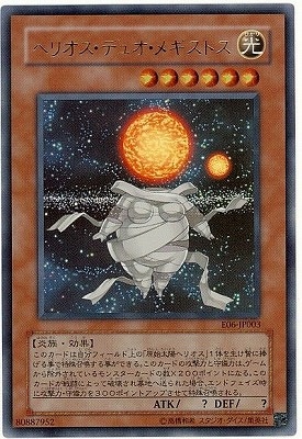 《ヘリオス・デュオ・メギストス/Helios Duo Megistus》 † 効果モンスター 星6/光属性/炎族/攻 ?/守 ? このカードは自分フィールド上の「原始太陽ヘリオス」1体を 生け贄に捧げる事で特殊召喚する事ができる。 このカードの攻撃力と守備力は、 ゲームから除外されているモンスターカードの数×200ポイントになる。 このカードが戦闘によって破壊され墓地へ送られた場合、 エンドフェイズ時に攻撃力・守備力を300ポイントアップさせて特殊召喚される。
