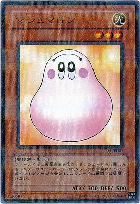 《マシュマロン/Marshmallon》 † 効果モンスター 星3/光属性/天使族/攻 300/守 500 (1):このカードは戦闘では破壊されない。 (2):裏側表示のこのカードが攻撃されたダメージ計算後に発動する。 このカードを攻撃したモンスターのコントローラーは1000ダメージを受ける。