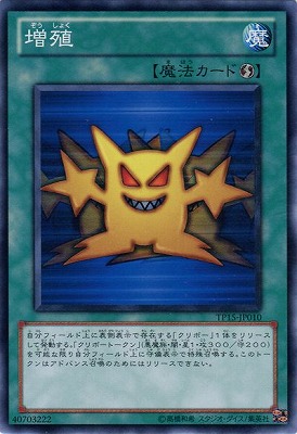 《増殖ぞうしょく/Multiply》 † 速攻魔法 自分フィールド上に表側表示で存在する「クリボー」1体をリリースして発動できる。 自分フィールド上に「クリボートークン」(悪魔族・闇・星1・攻300/守200)を 可能な限り守備表示で特殊召喚する。 このトークンはアドバンス召喚のためにはリリースできない。