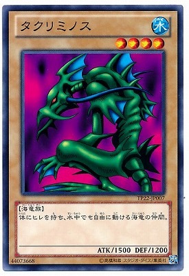 《タクリミノス/Takriminos》 † 通常モンスター 星4/水属性/海竜族/攻1500/守1200 体にヒレを持ち、水中でも自由に動ける海竜の仲間。