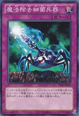 《魔法除去細菌兵器まほうじょきょさいきんへいき/Virus Cannon》 † 通常罠 (1):トークン以外の自分フィールドのモンスターを任意の数だけリリースして発動できる。 リリースしたモンスターの数だけ、相手はデッキから魔法カードを選んで墓地へ送る。