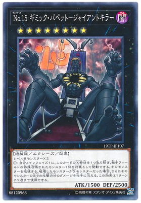 No.ナンバーズ15 ギミック・パペット−ジャイアントキラー/Number 15: Gimmick Puppet Giant Grinder》 † エクシーズ・効果モンスター ランク8/闇属性/機械族/攻1500/守2500 レベル8モンスター×2 (1):自分メインフェイズ1に、このカードのX素材を1つ取り除き、 相手フィールドの特殊召喚されたモンスター1体を対象として発動できる。 そのモンスターを破壊する。 破壊したモンスターがXモンスターだった場合、 さらにそのモンスターの元々の攻撃力分のダメージを相手に与える。 この効果は1ターンに2度まで使用できる。