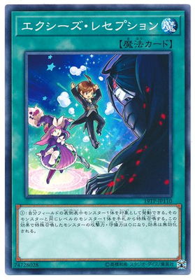 エクシーズ・レセプション/Xyz Reception》 † 通常魔法 (1):自分フィールドの表側表示モンスター1体を対象として発動できる。 そのモンスターと同じレベルのモンスター1体を手札から特殊召喚する。 この効果で特殊召喚したモンスターの攻撃力・守備力は0になり、効果は無効化される。