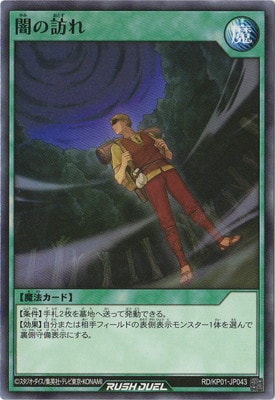 《闇やみの訪おとずれ》 † 通常魔法 【条件】手札2枚を墓地へ送って発動できる。 【効果】自分または相手フィールドの表側表示モンスター1体を選んで裏側守備表示にする。