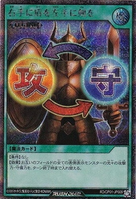 《右手みぎてに盾たてを左手ひだりてに剣けんを》 † 通常魔法(LEGEND) 【条件】なし 【効果】お互いのフィールドの全ての表側表示モンスターの元々の攻撃力・守備力を、 ターン終了時まで入れ替える。