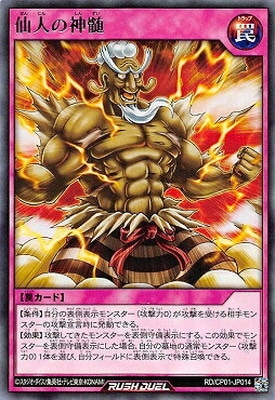 《仙人せんにんの神髄しんずい》 † 罠カード 【条件】自分の表側表示モンスター(攻撃力0)が 攻撃を受ける相手モンスターの攻撃宣言時に発動できる。 【効果】攻撃してきたモンスターを表側守備表示にする。 この効果でモンスターを表側守備表示にした場合、 自分の墓地の通常モンスター(攻撃力0)1体を選び、 自分フィールドに表側表示で特殊召喚できる。