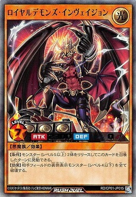 《ロイヤルデモンズ・インヴェイジョン》 † 効果モンスター 星7/光属性/悪魔族/攻2300/守 0 【条件】モンスター(レベル5以上)2体をリリースしてこのカードを召喚したターンに発動できる。 【効果】相手フィールドの表側表示モンスター(レベル4以下)を全て破壊する。