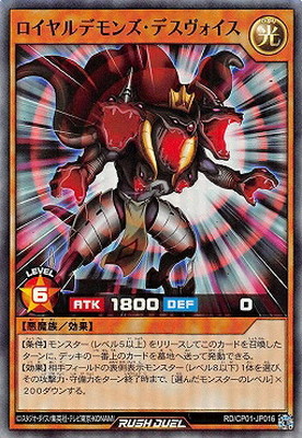 《ロイヤルデモンズ・デスヴォイス》 † 効果モンスター 星6/光属性/悪魔族/攻1800/守 0 【条件】モンスター(レベル5以上)をリリースしてこのカードを召喚したターンに、 デッキの一番上のカードを墓地へ送って発動できる。 【効果】相手フィールドの表側表示モンスター(レベル8以下)1体を選び、 その攻撃力・守備力をターン終了時まで、[選んだモンスターのレベル]×200ダウンする。