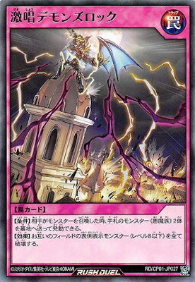 《激唱げきしょうデモンズロック》 † 罠カード 【条件】相手がモンスターを召喚した時、 手札のモンスター(悪魔族)2体を墓地へ送って発動できる。 【効果】お互いのフィールドの表側表示モンスター(レベル8以下)を全て破壊する。