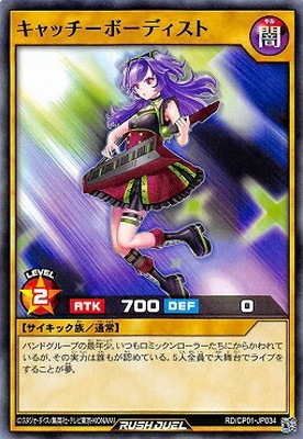 《キャッチーボーディスト》 † 通常モンスター 星2/闇属性/サイキック族/攻 700/守 0 バンドグループの最年少。 いつもロミックンローラーたちにからかわれているが、 その実力は誰もが認めている。 5人全員で大舞台でライブをすることが夢。