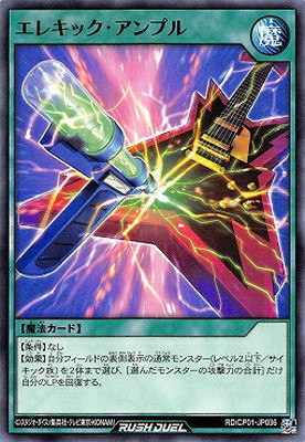 《エレキック・アンプル》 † 通常魔法 【条件】なし 【効果】自分フィールドの表側表示の通常モンスター(レベル2以下/サイキック族)を2体まで選び、 [選んだモンスターの攻撃力の合計]だけ自分のLPを回復する。