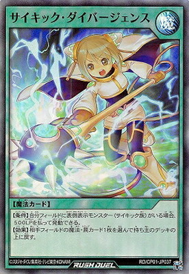 《サイキック・ダイバージェンス》 † 通常魔法 【条件】自分フィールドに表側表示モンスター(サイキック族)がいる場合、 500LPを払って発動できる。 【効果】相手フィールドの魔法・罠カード1枚を選んで持ち主のデッキの上に戻す。