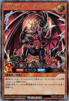 《ロイヤルデモンズ・インヴェイジョン》 † 効果モンスター 星7/光属性/悪魔族/攻2300/守 0 【条件】モンスター(レベル5以上)2体をリリースしてこのカードを召喚したターンに発動できる。 【効果】相手フィールドの表側表示モンスター(レベル4以下)を全て破壊する。