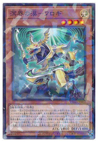 溟界めいかいの漠すなはら−フロギ》 † 効果モンスター 星4/光属性/爬虫類族/攻1800/守1400 このカード名の(1)(2)の効果はそれぞれ1ターンに1度しか使用できない。 (1):このカードが、フィールドから墓地へ送られた場合、 または墓地からの特殊召喚に成功した場合、 相手フィールドの表側表示モンスター1体と、 そのモンスターの攻撃力以上の攻撃力を持つ相手の墓地のモンスター1体を対象として発動できる。 対象の墓地のモンスターを相手フィールドに特殊召喚し、対象の相手フィールドのモンスターを墓地へ送る。 (2):このカードが墓地に存在する場合、手札を1枚墓地へ送って発動できる。 このカードを手札に加える。