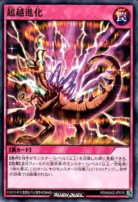 《超越進化ちょうえつしんか》 † 罠カード 【条件】相手がモンスター(レベル7以上)を召喚した時に発動できる。 【効果】自分フィールドの表側表示モンスター(レベル7以上/恐竜族)1体を選ぶ。 このターン、そのモンスターの攻撃力は1500アップし、相手の効果では破壊されない。