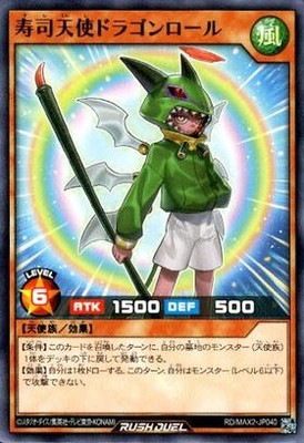 《寿司天使すしてんしドラゴンロール》 † 効果モンスター 星6/風属性/天使族/攻1500/守 500 【条件】このカードを召喚したターンに、自分の墓地のモンスター(天使族)1体をデッキの下に戻して発動できる。 【効果】自分は1枚ドローする。 このターン、自分はモンスター(レベル6以下)で攻撃できない。