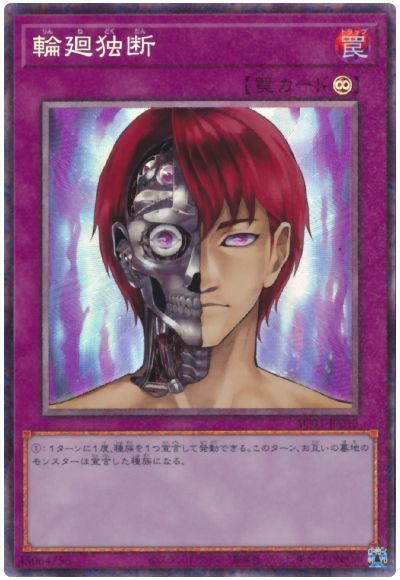 《輪廻独断りんねどくだん》 † 永続罠 (1):1ターンに1度、種族を1つ宣言して発動できる。 このターン、お互いの墓地のモンスターは宣言した種族になる。