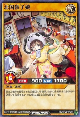 《北国餃子娘ノーザン・ギョーザ・むすめ》 † 通常モンスター 星5/光属性/水族/攻 900/守1700 働き方改革を提唱する北国飯店の看板娘。 数多の企業戦士たちが定時退社して来店するが、そのころには彼女自身も帰っている。