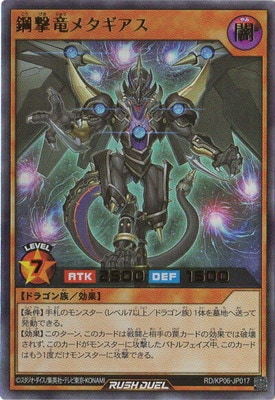 《鋼撃竜こうげきりゅうメタギアス》 † 効果モンスター 星7/闇属性/ドラゴン族/攻2500/守1500 【条件】手札のモンスター(レベル7以上/ドラゴン族)1体を墓地へ送って発動できる。 【効果】このターン、このカードは戦闘と相手の罠カードの効果で破壊されず、 このカードがモンスターに攻撃したバトルフェイズ中、 このカードはもう1度だけモンスターに攻撃できる。