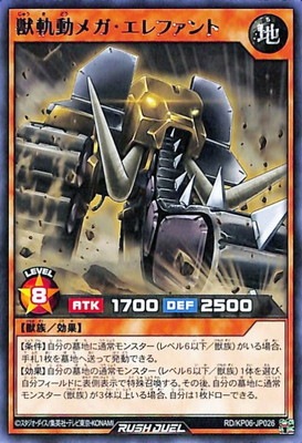 《獣軌動じゅうきどうメガ・エレファント》 † 効果モンスター 星8/地属性/獣族/攻1700/守2500 【条件】自分の墓地に通常モンスター(レベル6以下/獣族)がいる場合、 手札1枚を墓地へ送って発動できる。 【効果】自分の墓地の通常モンスター(レベル6以下/獣族)1体を選び、 自分フィールドに表側表示で特殊召喚する。 その後、墓地に通常モンスター(獣族)が3体以上いる場合、自分は1枚ドローできる。