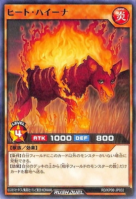 《ヒート・ハイーナ》 † 効果モンスター 星4/炎属性/獣族/攻1000/守 800 【条件】自分フィールドにこのカード以外のモンスターがいない場合に発動できる。 【効果】自分のデッキの上から[相手フィールドのモンスターの数]だけカードを墓地へ送る。