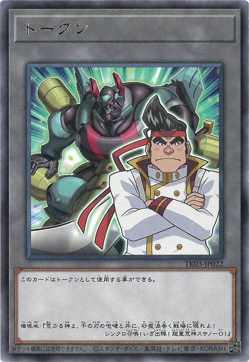 《トークン》(権現坂昇) † このカードはトークンとして使用する事ができる。 権現坂:『荒ぶる神よ、千の刃の咆哮と共に、砂塵渦巻く戦場に現れよ!  シンクロ召喚!いざ出陣!超重荒神スサノ−O!』