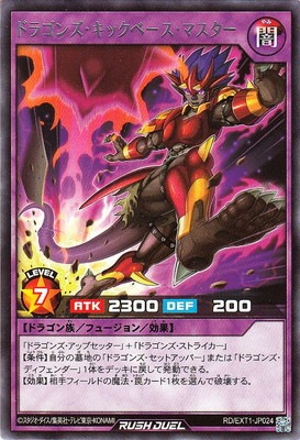 《ドラゴンズ・キックベース・マスター》 † フュージョン・効果モンスター 星7/闇属性/ドラゴン族/攻2300/守 200 「ドラゴンズ・アップセッター」+「ドラゴンズ・ストライカー」 【条件】自分の墓地の「ドラゴンズ・セットアッパー」または「ドラゴンズ・ディフェンダー」1体をデッキに戻して発動できる。 【効果】相手フィールドの魔法・罠カード1枚を選んで破壊する。