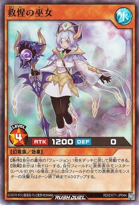 《救惺きゅうせいの巫女みこ》 † 効果モンスター 星4/水属性/幻竜族/攻1200/守 0 【条件】自分の墓地の「フュージョン」1枚をデッキに戻して発動できる。 【効果】自分は1枚ドローする。 自分フィールドに表側表示モンスター(レベル9)がいる場合、 さらに自分フィールドの全ての表側表示モンスターの攻撃力はターン終了時まで400アップする。