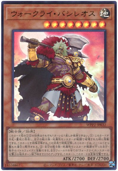 ウォークライ・バシレオス/War Rock Bashileos》 † 効果モンスター 星8/地属性/戦士族/攻2700/守2700 このカード名の(1)(2)の効果は1ターンに1度しか使用できない。 (1):このカードが手札・墓地に存在し、自分の戦士族・地属性モンスターが戦闘で破壊された時に発動できる。 このカードを特殊召喚する。 この効果で特殊召喚したこのカードは、フィールドから離れた場合に除外される。 (2):自分の戦士族・地属性モンスターが戦闘を行った自分・相手のバトルフェイズに発動できる。 自分フィールドの全ての「ウォークライ」モンスターの攻撃力は相手ターン終了時まで200アップする。 このターン、このカードは直接攻撃できる。