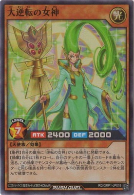 《大逆転だいぎゃくてんの女神めがみ》 † 効果モンスター 星7/光属性/天使族/攻2400/守2000 【条件】自分の墓地に「逆転の女神」がいる場合に発動できる。 【効果】自分は1枚ドローし、自分のデッキの一番上のカードを墓地へ送る。 この効果でモンスターが墓地へ送られた場合、 そのモンスターと同じ種族を持つ相手フィールドの表側表示モンスター2体を選んで破壊できる。