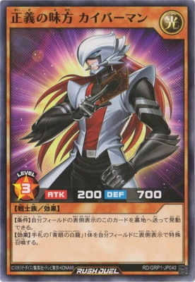 《正義せいぎの味方みかた カイバーマン》 † 効果モンスター 星3/光属性/戦士族/攻 200/守 700 【条件】自分フィールドの表側表示のこのカードを墓地へ送って発動できる。 【効果】手札の「青眼の白龍」1体を自分フィールドに表側表示で特殊召喚する。