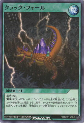 《クラック・フォール》 † 通常魔法 【条件】なし 【効果】お互いのフィールドゾーンのカードを全て破壊する。 この効果でカードを破壊した場合、さらに相手フィールドの表側表示モンスター1体を選んで その攻撃力・守備力をターン終了時まで1000ダウンできる。