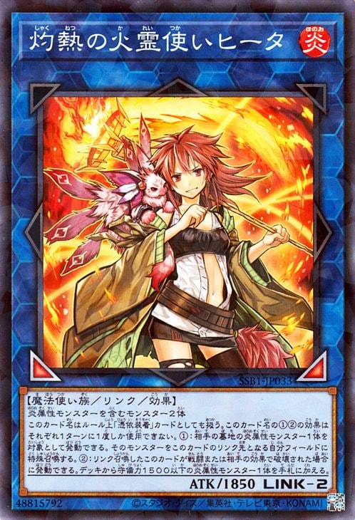 《灼熱しゃくねつの火霊使かれいつかいヒータ/Hiita the Fire Charmer, Ablaze》 † リンク・効果モンスター リンク2/炎属性/魔法使い族/攻1850 【リンクマーカー:左下/右下】 炎属性モンスターを含むモンスター2体 このカード名はルール上「憑依装着」カードとしても扱う。 このカード名の(1)(2)の効果はそれぞれ1ターンに1度しか使用できない。 (1):相手の墓地の炎属性モンスター1体を対象として発動できる。 そのモンスターをこのカードのリンク先となる自分フィールドに特殊召喚する。 (2):リンク召喚したこのカードが戦闘または相手の効果で破壊された場合に発動できる。 デッキから守備力1500以下の炎属性モンスター1体を手札に加える。