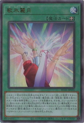 《歌氷麗月かひょうれいげつ》 † 装備魔法 このカード名の(1)(2)の効果はそれぞれ1ターンに1度しか使用できない。 (1):手札からレベル4以下の天使族・魔法使い族・鳥獣族・獣戦士族モンスター1体を特殊召喚し、このカードを装備する。 その後、フィールドのドラゴン族モンスターを全て持ち主の手札に戻す事ができる。 (2):魔法&罠ゾーンの表側表示のこのカードが墓地へ送られたターンのエンドフェイズに発動できる。 デッキから「融合」魔法カードまたは「フュージョン」魔法カード1枚または「パラサイト・フュージョナー」1体を手札に加える。