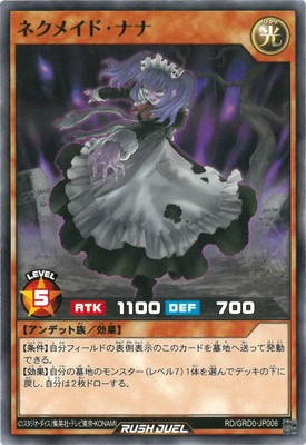 《ネクメイド・ナナ》 † 効果モンスター 星5/光属性/アンデット族/攻1100/守 700 【条件】自分フィールドの表側表示のこのカードを墓地へ送って発動できる。 【効果】自分の墓地のモンスター(レベル7)1体を選んでデッキの下に戻し、自分は2枚ドローする。