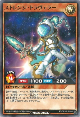 《ストレンジ・トラヴェラー》 † 効果モンスター 星4/光属性/ギャラクシー族/攻1100/守 200 【条件】自分フィールドに表側表示の通常モンスター(ギャラクシー族)がいる場合、 デッキの一番上のカードを墓地へ送って発動できる。 【効果】相手フィールドの表側表示モンスター1体を選び、 その攻撃力をターン終了時まで500ダウンする。