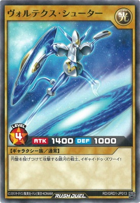 《ヴォルテクス・シューター》 † 通常モンスター 星4/光属性/ギャラクシー族/攻1400/守1000 円盤を投げつけて攻撃する銀河の戦士。 イギャイ・ドゥ・ズワーイ!