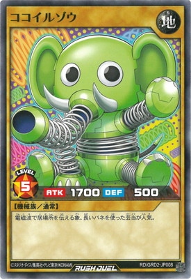 《ココイルゾウ》 † 通常モンスター 星5/地属性/機械族/攻1700/守 500 電磁波で居場所を伝える象。 長いバネを使った芸当が人気。