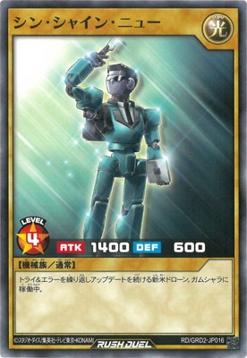 《シン・シャイン・ニュー》 † 通常モンスター 星4/光属性/機械族/攻1400/守 600 トライ&エラーを繰り返しアップデートを続ける新米ドローン。 ガムシャラに稼働中。