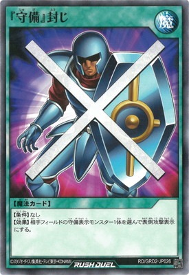 《『守備しゅび』封ふうじ》 † 通常魔法 【条件】なし 【効果】相手フィールドの守備表示モンスター1体を選んで表側攻撃表示にする。