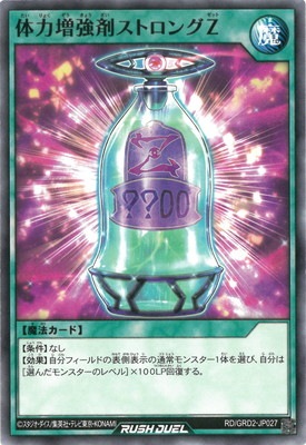 《体力増強剤たいりょくぞうきょうざいストロングZゼット》 † 通常魔法 【条件】なし 【効果】自分フィールドの表側表示の通常モンスター1体を選び、 自分は[選んだモンスターのレベル]×100LP回復する。