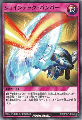 《ジョインテック・バンパー》 † 罠カード 【条件】相手モンスターの直接攻撃宣言時、 自分の墓地の通常モンスター(機械族)3体をデッキに戻して発動できる。 【効果】相手フィールドの攻撃表示モンスターを3体まで選んで破壊する。